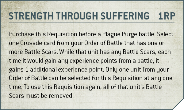 Strength Through Suffering (1 RP)- is used before a battle to pick a unit that has any Battle Scars. While that unit has any battle scars, it gets +1 XP any time they earn any XP during the battle. You can only use this on one unit at a time and in order to use it again you have to remove all of the battle scars from the unit.