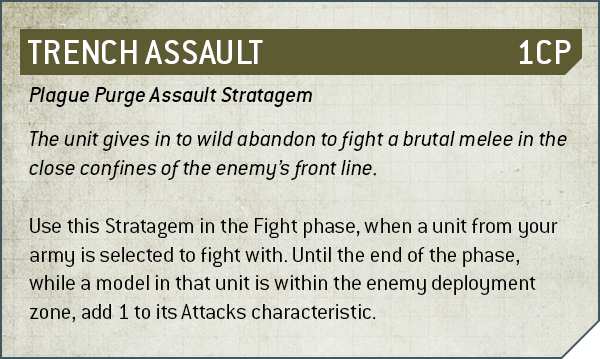 Trench Assault (1 CP) adds +1 to the Attacks characteristic of a unit wholly within the enemy deployment zone.
