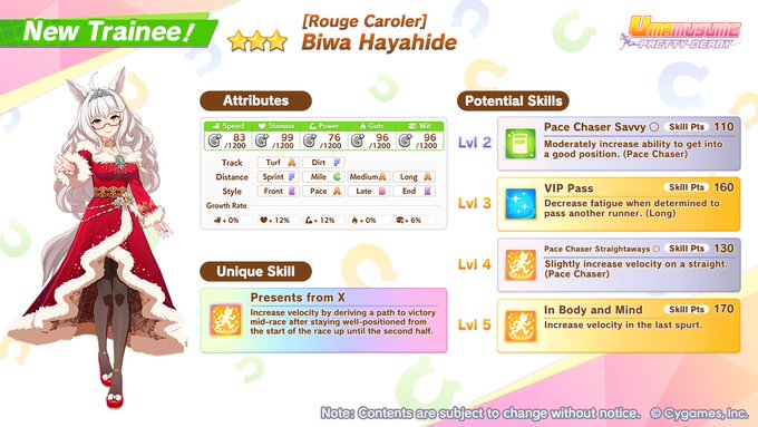 Of the two, Oguri is the better choice, but if you do happen to obtain either one, know that they can be built to be very strong trainees with Xmas Biwa at Pace and Xmas Oguri at either Late or End Closer. Why they are both so good has to do with their Uniques and Innate skills, with Xmas Oguri in particular coming with multiple Recovery skills in her own kit (Particularly, Gourmand for Pace, which you aren’t going to run her at here), and a Unique that gives her speed if she’s recovered 3 times during the race. You will likely want to get Oguri to have multiple White recovery skills over stacking Golds, because you need to ensure they activate and Gold skills are extremely expensive.