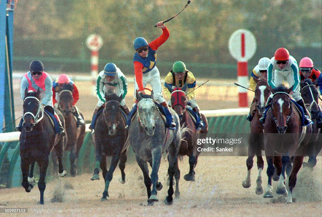 Yutaka Take's victorious pose as Oguri Cap won the 1990 Arima Kinen. (Credit: Sankei, GettyImages)