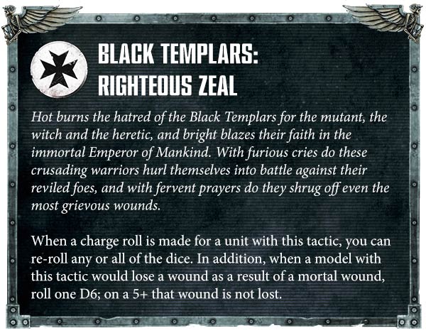 Wings Note: I would be astonished if this isn't cleared at least partially cleared up in an FAQ very quickly, so probably don't get too excited. I'd expect a "doesn't apply to Black Templars" rider to be added to Legacy of Down in the Fist book FAQ at the very least, and probably the rest of it shut down as well. The only bit I'm unsure about is stratagems - Black Templars are missing some "boilerplate" ones that every Marine army seems to get, and it will be a little weird if they end up having the least of any Marine faction. However, it would also be weird if they ended up having more than everyone else too, so I'm expecting them to go.