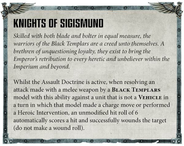 While the Assault Doctrine is active, when making an attack with a Black Templars model’s melee weapon against a non-VEHICLE model, if you charged or made a Heroic Intervention that turn, unmodified rolls of 6 to hit automatically scores a hit and wounds the target (do not roll to wound). This is a good ability for melee units, helping push through lower-strength attacks and creating additional efficiency. In practice, if you’re throwing 30 chainsword attacks at a unit of marines, this is good for an additional unsaved wound, on average. It’s going to do the most work on strength 4 attacks where you have a lower chance of wounding but decent AP. Which means power swords. Which is very flavorful, but not quite enough of a reason to try fitting a bunch into your lists.