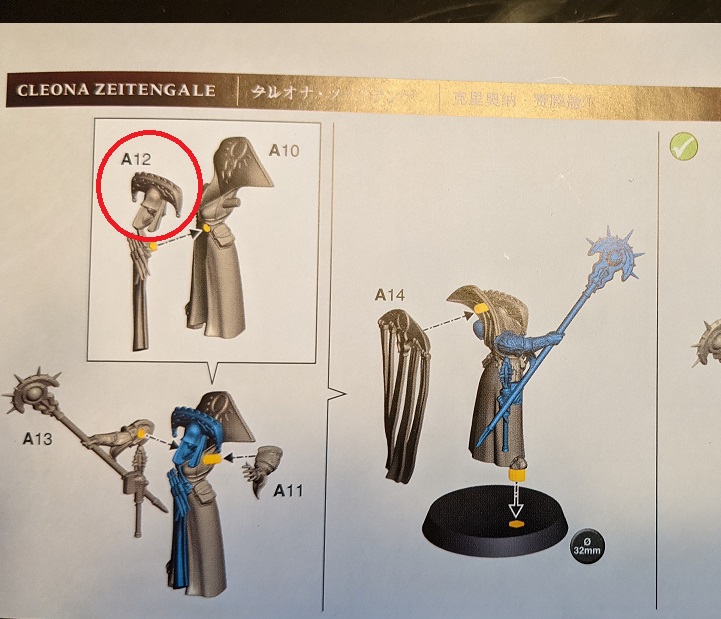 “A12” (face, hat, throwing knives and a bit of robe) is listed as the first part to add to her torso, but you will want to add her arms first. If you follow the instructions you will be unable to attach the arms without damaging her hat.