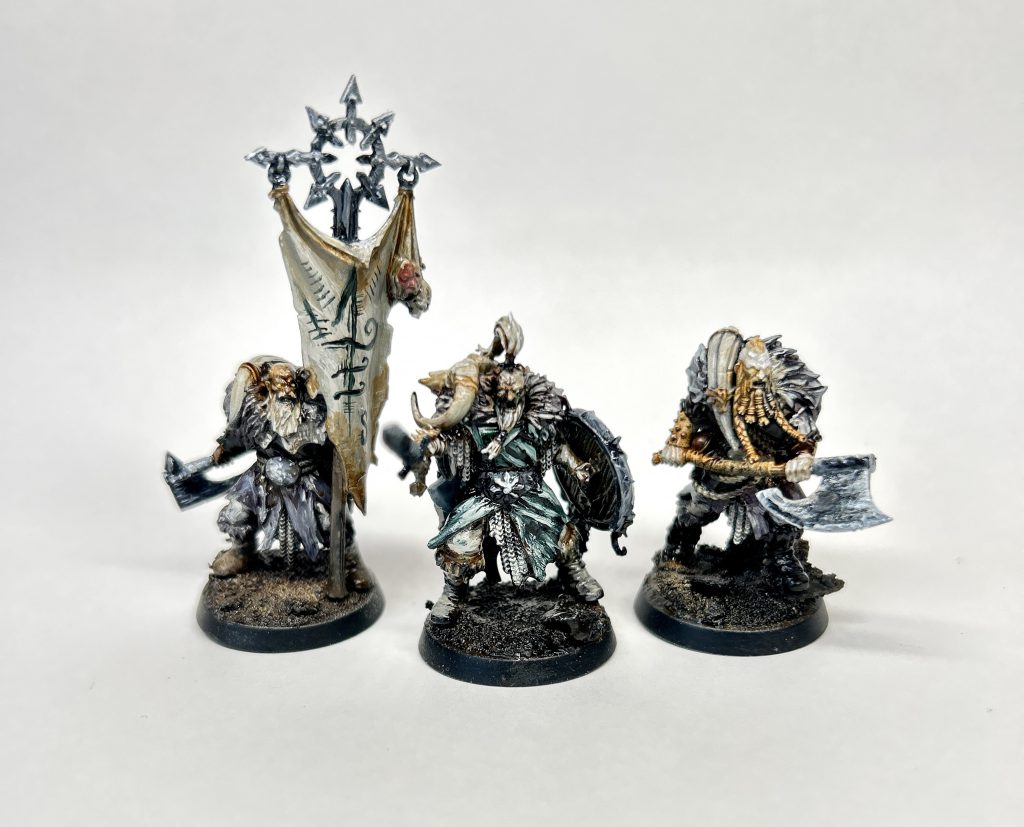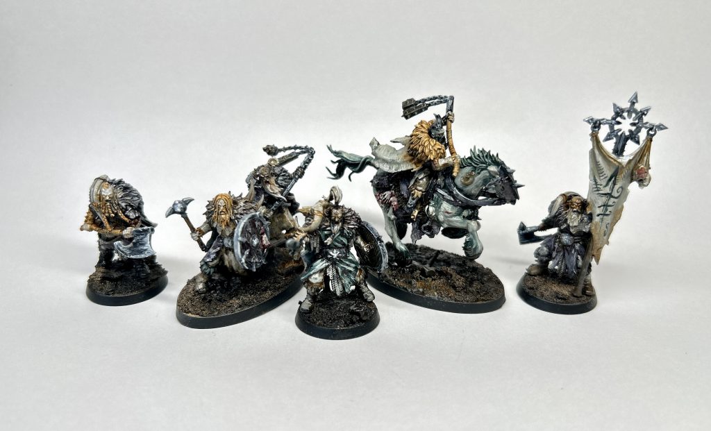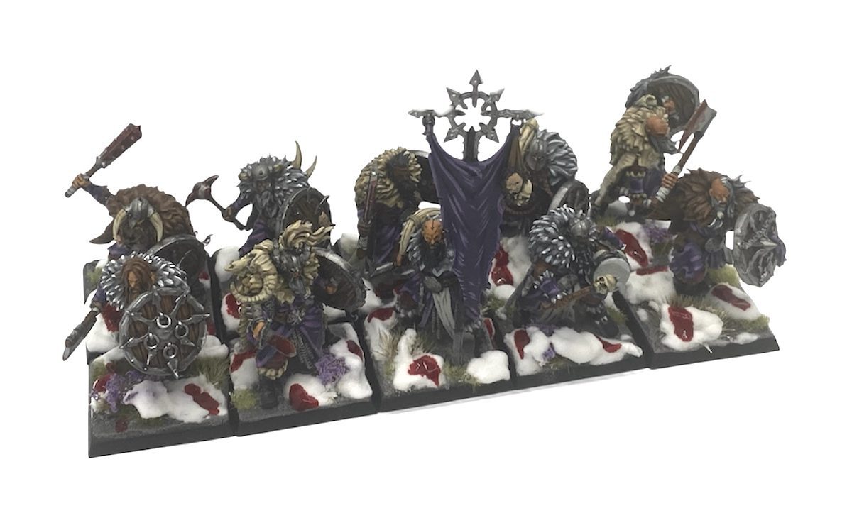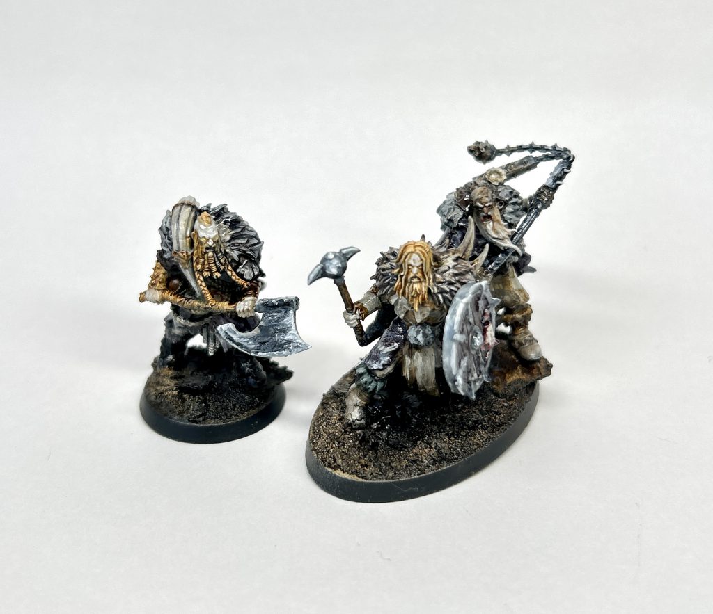 As Liam says, the fur and layers these goons have on really sells the ‘cold north’ vibe, and I’m here for it. This sets these models apart from the Darkoath range (and most of the other Chaos AoS humans), who have the trad loincloth and can-do-attitude and little else on. This is where I feel there is a misstep, as you could very easily have had woman in here, as wrapped and layered bodies all really look about the same!? That aside the look and feel is sold well. Heavy clothes, bones, skulls of defeated enemies and chaos icons worked subtly into it all.