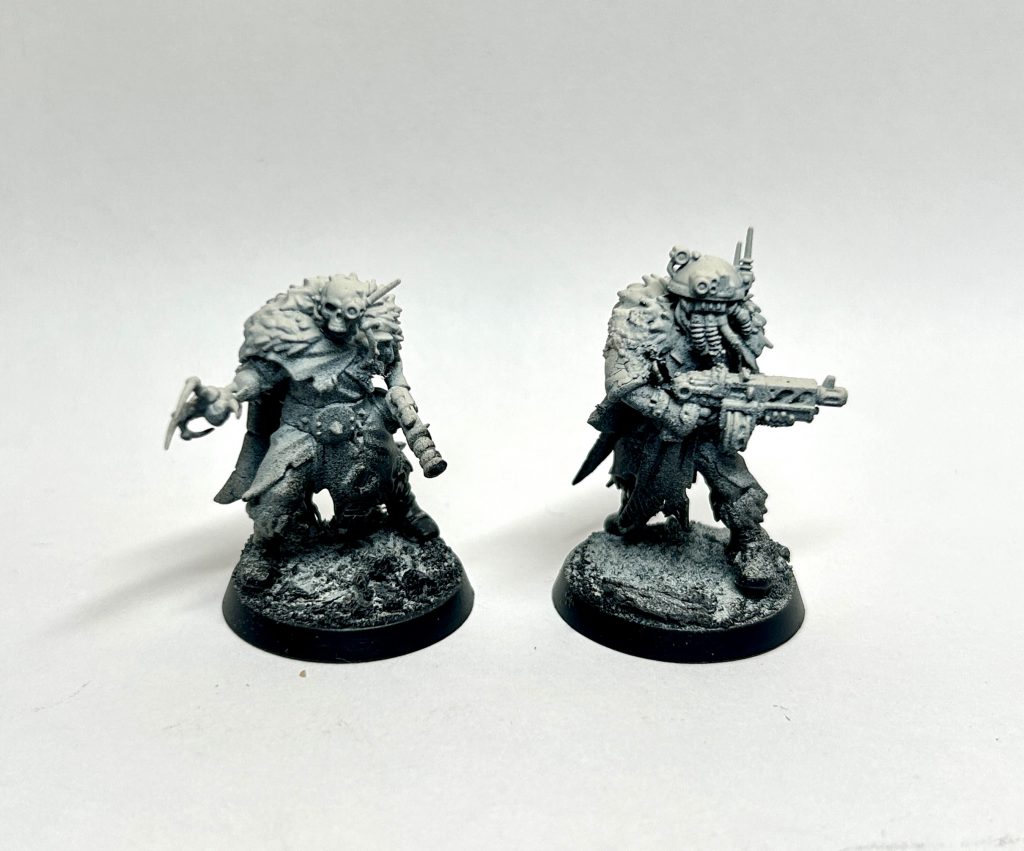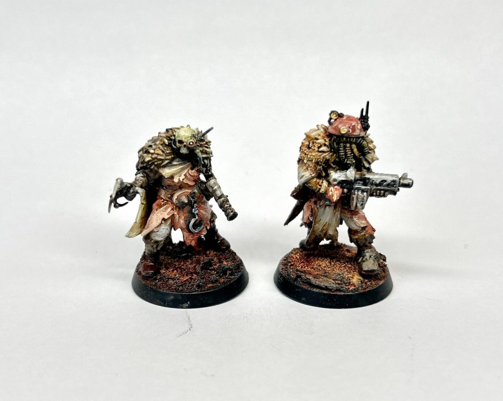 badusernametag: Something immediately struck me about these that they would make amazing techno-barbarians. Blanchitsu style. Maybe something about the hunched, solid silhouette, or the many layers of patchwork clothing. Or maybe just as Bair said, “every kit is a Necromunda kit”. Anyway, bashed a couple together for you and did a de-saturated sepia scheme. Filthy and dusty and lovely! Maybe a horde of these would make for some interesting militia in 30k…
