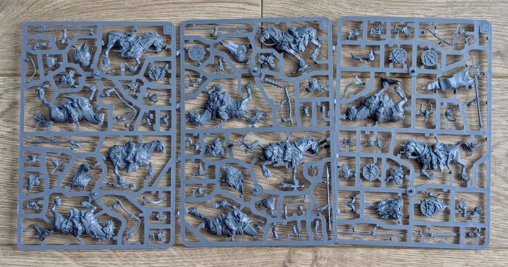 badusernametag: Horses are big. Like really big creatures that stand as tall as a man at the shoulder. This is often lost a little in miniatures I feel, but this kit really does the job of demonstrating this. The horses feel large and powerful. Really into it. We see the designs carry over from the infantry here, with the same weapons, layers of furs and skins etc. You get full options for command in each five and then either spears or flails.