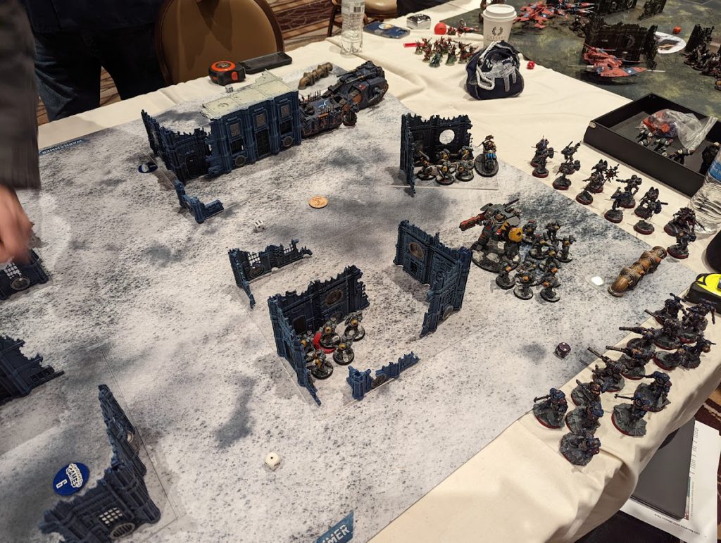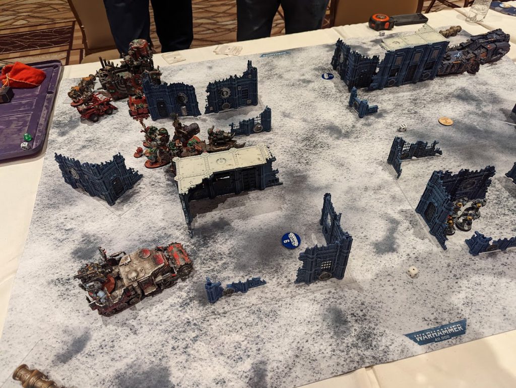 While we were unable to fully destroy the Kill Rig, we were able to knock it into its lowest bracket. In the bottom of turn 1, the Ork players were able to send in a vehicle with a Mega-Armored Warboss with all sorts of goodstuff (Competitive Edge amongst other things). This area became something of a killzone, in which my Redemptor, Ragnar Blackmane, my Wolf Priest on Bike, and two squads of Intercessors met their end. They gave as good as they got, eventually killing the Mega Armored Warboss, some Meganobz, the Warboss' ride, and some of the new Beastsnagga beasties. Ivan's Sicaran did quite well, smashing through some of the other Battlewagons, Nobz, and Grots on the battlefield.