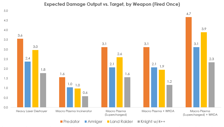 Weapons from the Dark Age Stratagem, which turns the Macro Plasma Incinerator into a much stronger weapon; it's 1.75x better against hordes with its ability to average 7 shots each time it double-fires (and in regular charge mode), while supercharged with an additional +1 damage, it's suddenly a more effective weapon than the Heavy Laser Destroyer, and one with more upside (