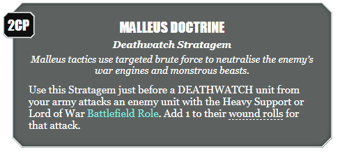 Malleus Doctrine, a 2 CP stratagem that gives a Deathwatch unit from your army +1 to its Wound rolls when shooting at a Heavy Support or Lord of War unit. This doesn't need a ton of explanation - functionally the two main guns on the Executioner already give you S9+ so against almost any target in the game, this gives you a 2+ on your To Wound roll, which is a significant increase in potency.
