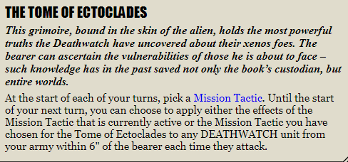 Those two stratagems will cover your firing needs for a single turn with regard to make sure you get 2+ To Wound rolls on all targets, big and small. Now we just need to do something about those pesky 1s. Fortunately, Mission Tactics have us covered, letting us re-roll To Wound rolls of 1 so we can turn our 83% chance of wounding into something more like a certainty. You might say "but Goonhammer, you can't use Mission Tactics on a vehicle!" That's true, but you're in luck - you can use the Tome of Ectoclades relic to give your nearby DEATHWATCH units Mission Tactics, and that includes things which would normally not be able to benefit from them (check the FAQs). This relic works especially well on a Watch Master, because his aura gives you re-rolls on all failed To Hit rolls for your Deathwatch units within 6".