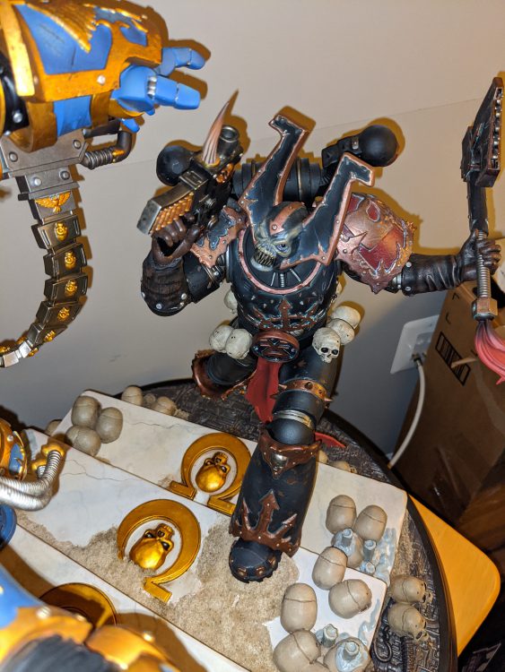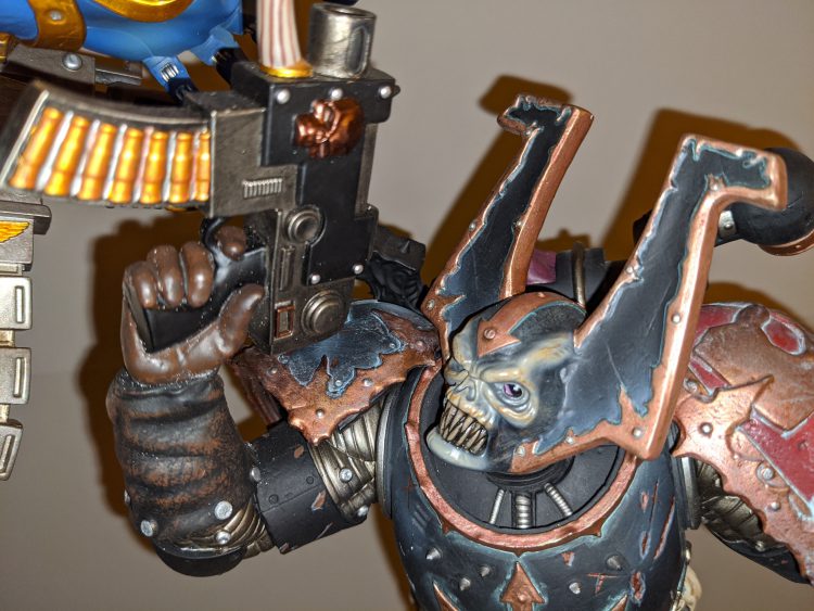 For the most part though, assembly is surprisingly easy and took me about an hour. While big pieces of polystone, the fit between the parts is exquisite, and there are embedded magnets to help the statue stay together and support its weight. The only real trouble I had assembling Guilliman was putting the ammo feed of the Hand of Dominion into the backpack. The slot is either angled strangely or too small, and I had trouble fitting the feed in. Otherwise, the statue was straightforward. Likewise, assembling the Chaos Marine was not difficult either. It has fewer parts and (mostly) less complicated than Big Bob, and so was an easy afterthought.