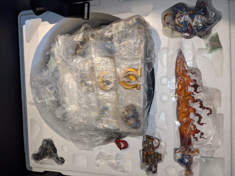In August of 2017, Games Workshop and a Singapore collectibles company, Hand-Made-Objects, announced that they would be producing a series of "1/6 scale epic dioramas". The announcement implied that Guilliman was going to be the first diorama released. As a collector of action figures, I was quite intrigued by this. HMO was a company that made absolutely awesome-looking anime and video game statues, but they were pricey. Still, it was Guilliman and I like Guilliman. This statue would be one of Guilliman just after his resurrection as detailed in "Rise of the Primarch", in which he cut a Black Legion Khorne Berzerker in two after coming out of Cawl's magic box. When they finally announced the pre-order for Guilliman in November of 2018, I decided to take the plunge. I figured that it would look fantastic on my desk in my office. It was set for a release in Q4 of 2019.