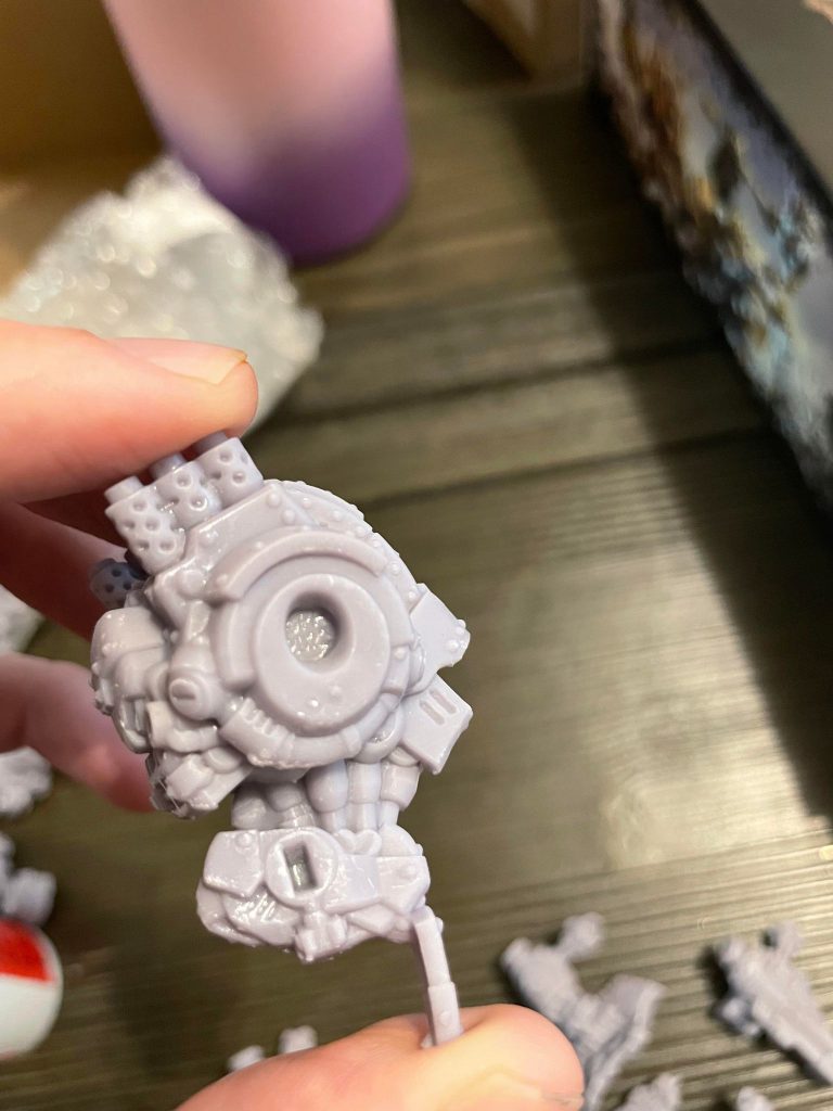 When I got my preview box and opened it, one of the things that I noticed were parts of the model that looked “wet”, as pictured above. Usually, this was in recessed areas on the model parts. I took some tweezers to check if the resin was liquid in these parts. I was able to confirm that this is not uncured resin. Rather, this is a side effect of 3-D printed resin models not being cleaned properly, causing this resin to cure while still in a liquid state. So these areas were safe to interact with on my models. However, it doesn’t look great, and it still means that there could be an uneven finish on your model.