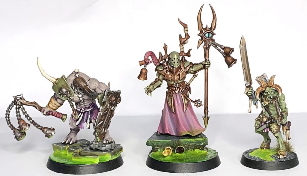 The Sorcerer is just the standard Slaves to Darkness Chaos Sorcerer with a Blight Kings head swap and a few bells and whistles added (hurr). The guy on the left is a converted Genestealer Cult Abbarant, and the other guy is Beasts of Chaos Ungor (all from box sets I've not painted).