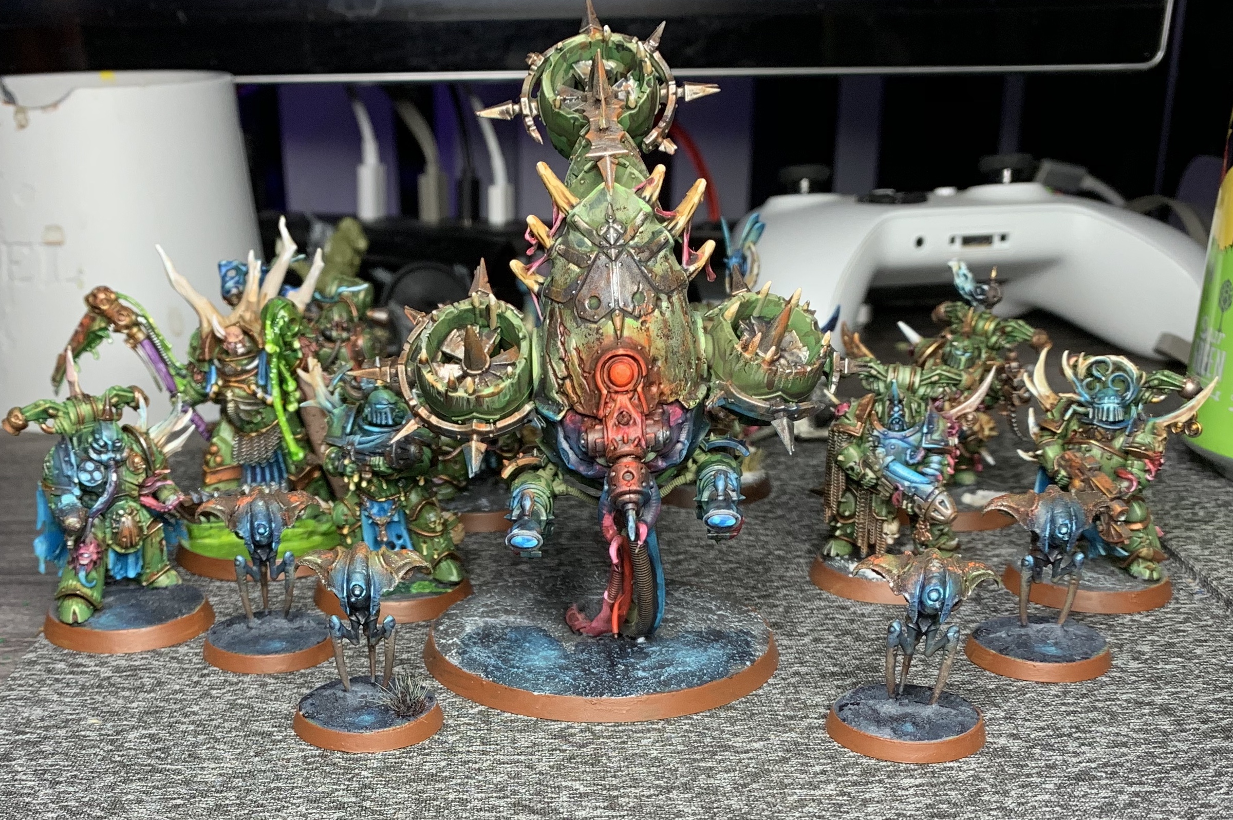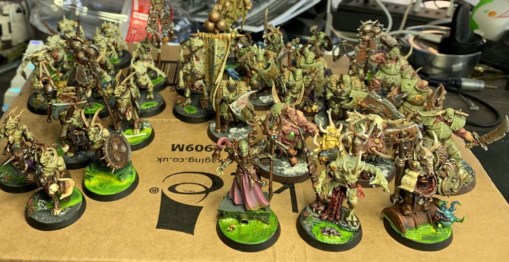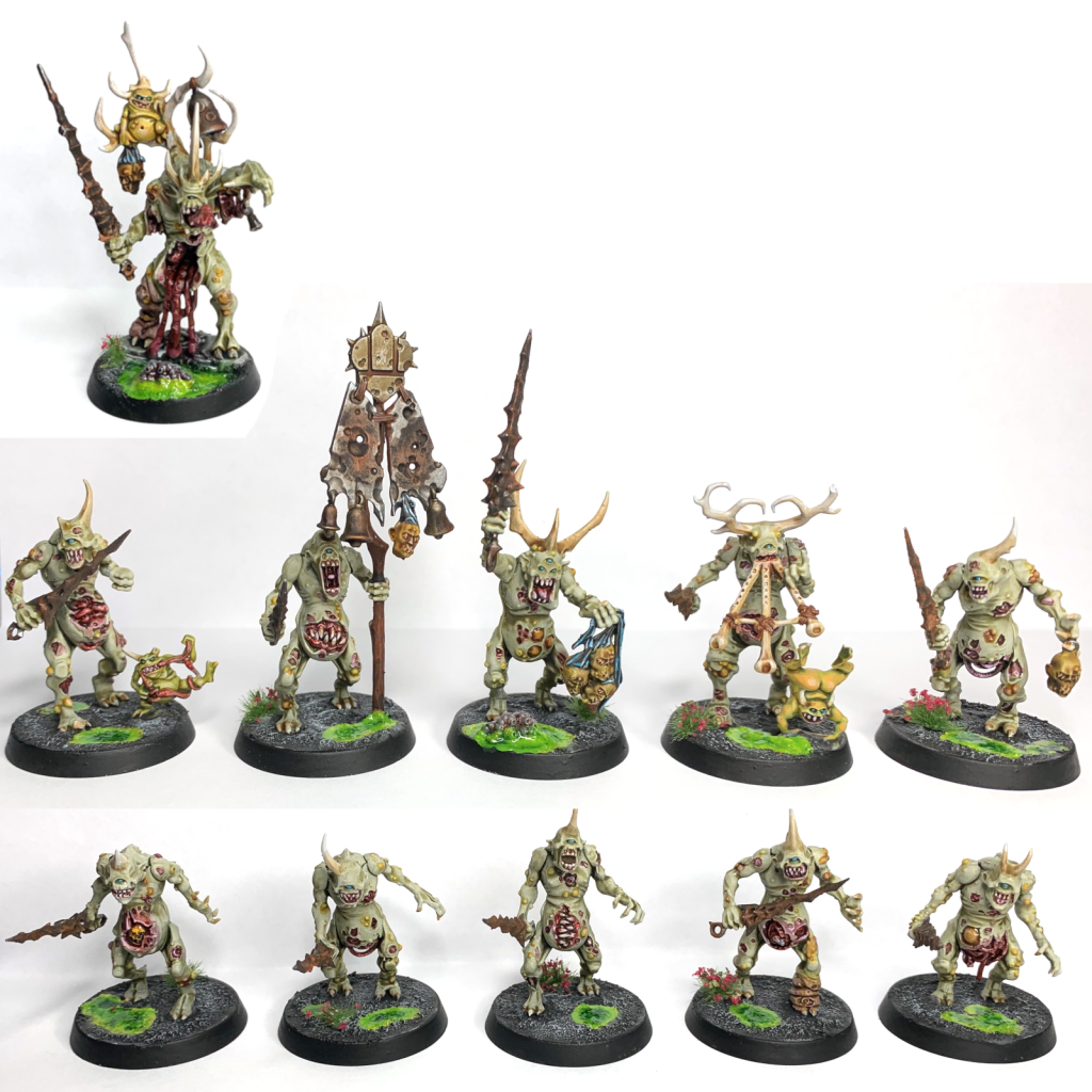 Needed some battleline units, so I painted up some trusty Plaguebearers (and the Herald/Poxbringer)
