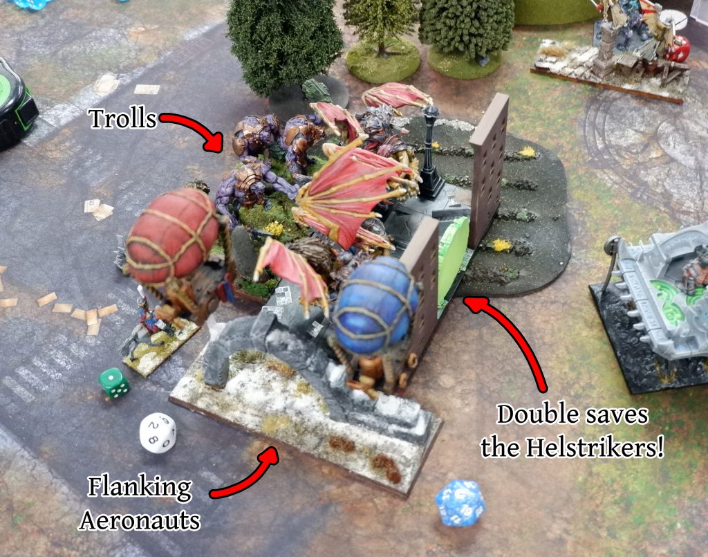 They would have been, were it not for the most fateful and timely of double one results for the Helstrikers’ Nerve Test. The Helstrikers stuck around, and the Aeronauts were just out of 3” of the token, so the objective was contested and my Riftforged Orcs won the game 2 points to 1.