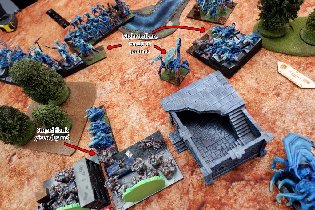 The answer is not much in terms of damage, but so much in terms of disrupting my army. This is because the Needlefangs are right in front of the other regiment of Legionaries; they can only see the rear and were to charge, they would be thrust right out from the protection of the Blocking Terrain and my battle line, surrounded by Nightstalkers. At the same time the Void Lurker has made its way around the Blocking Terrain, and I cannot just let it get a rear charge.