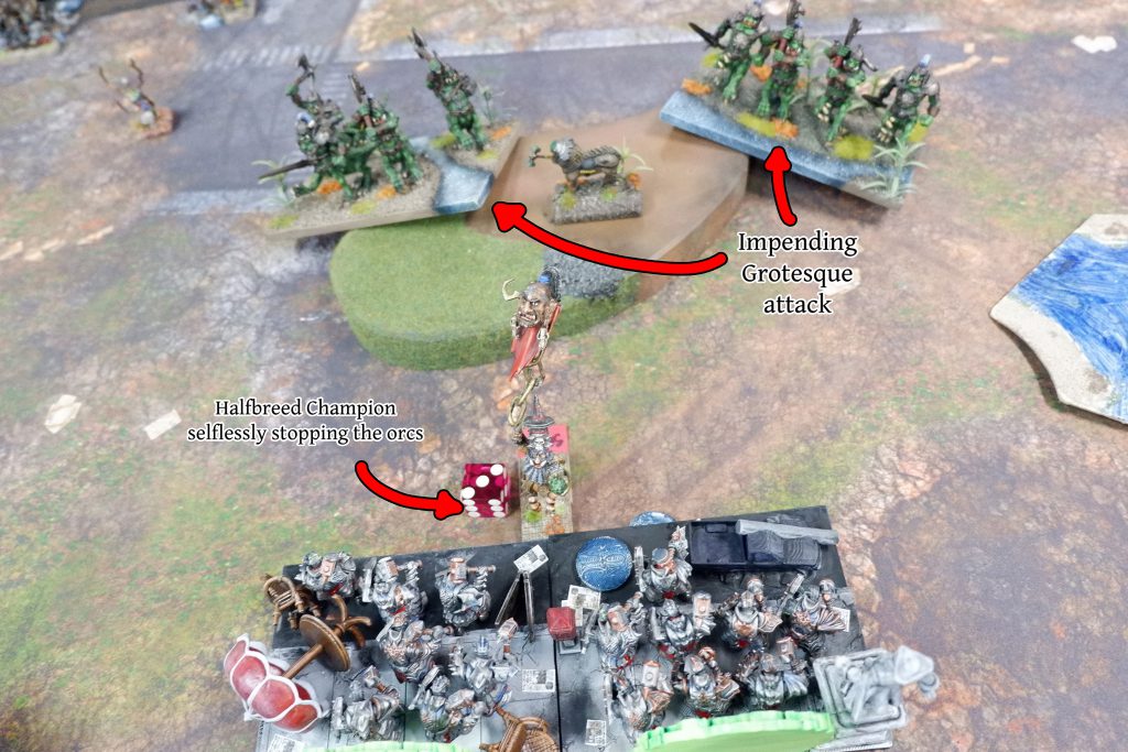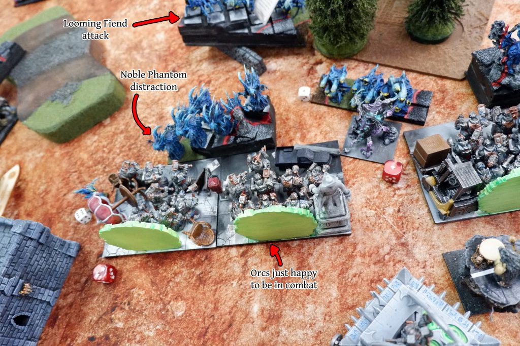 Which is exactly what I do in Turn 1. The horde of Orcs moves up, and stays there all game. I resist all temptation to charge them off.