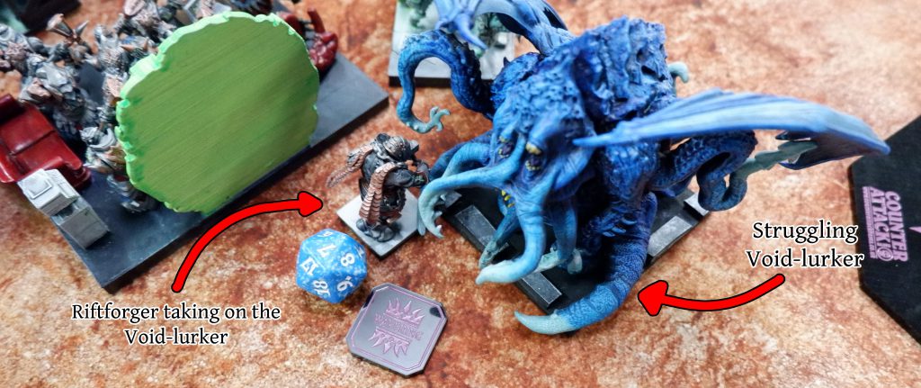 Meanwhile the Riftforged infantry ‘forged’ on, maintaining a holding pattern as the Grotesques closed in. As always, it is a single mistake that starts the carnage: a flank unchecked, taken by AG’s leftmost Grotesques into my Riftforged Legionary regiment. The left flank of my battleline was under pressure now, and much of the army had to turn to deal with it, leaving just the horde of Legionaries to stare down the other pair of Grotesques.