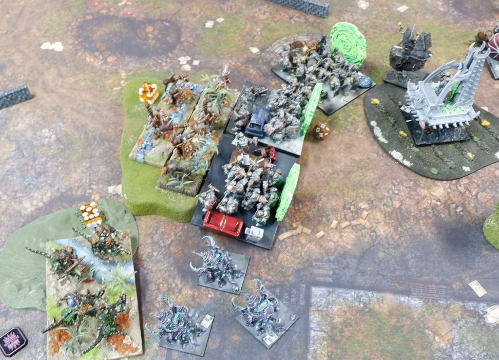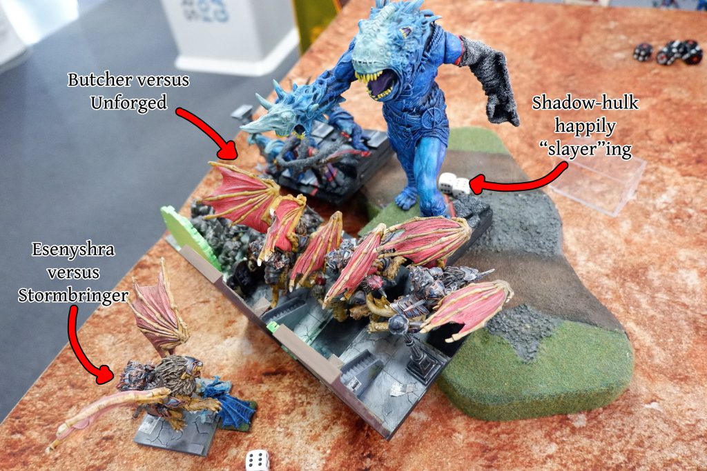 In Turn 6, the Stormforged Shrine surprised everyone by reminding us all it has 8 attacks with Crushing Strength (1) and promptly obliterated the already damaged horde of Fiends. With the Stormbringer and Shrine in the left scoring zone, Andy realised he needed to kill the Shrine, but couldn’t do it in a single round with the Butchers in Turn 7, leaving it contested.