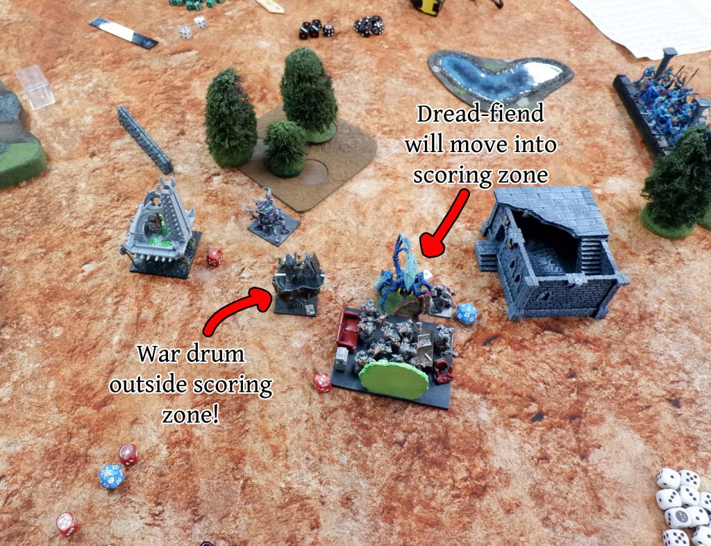 The Scarecrows successfully took the rightmost scoring zone, and so it was up to me to control the middle and get a draw. So I had the War Drum and an Ambarox against the Dread-fiend at the end of Turn 7… but I neglected to actually measure the Hold the Line scoring zone, thinking I could just whiff it. Turns out I was on the wrong side of scoring with the War Drum and Andy won the game!