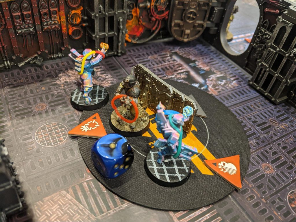 Mont’Ka. However, a lazy Medic positioning to open the left flank’s door allowed Wallace to stop my momentum. Between that mistake and my Gun drone failing to take down a Kommando grot I was only able to barely incapacitate 2 Kommandos on turn 1. However, that left one of my operatives locked in melee combat. Which you can see in the picture below.