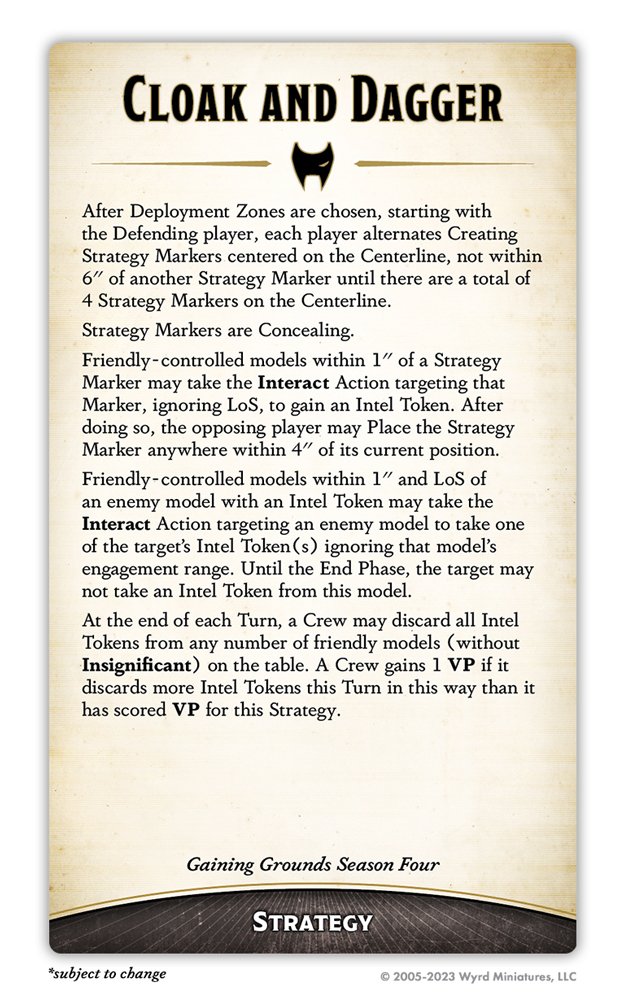 Endgame Condition: At the end of the game, if an enemy Master or Leader is within 2" and LoS of a friendly Scheme Marker, gain 1 VP.
