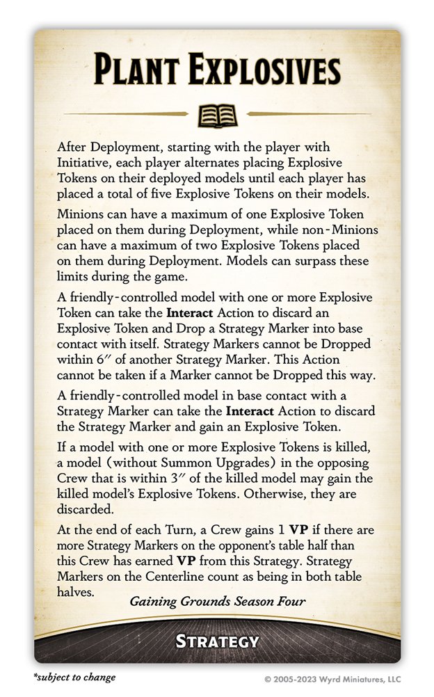 An oldie but a goody. Plant Explosives goes all the way back to GG0, and this version is only slightly updated. It starts off a bit like Cursed Objects, with you placing Tokens on your models after Deployment, but you place them on your
