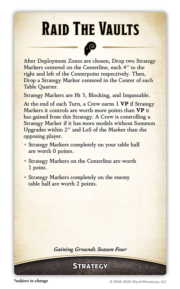 Raid the Vaults is the new version of Guard the Stash, and as the name implies, it’s a lot more aggressive. The difference is subtle but significant: you still can’t score “own-side” Markers, but Markers fully on the opponent’s side are worth 2. The immediate impact is that this Strategy is easier to cap, as it was next to impossible in GG3 outside of completely one-sided games. Another consideration is that now both players can fully cap this Strategy at the same time - no matter the deployment type, it’s possible for each player to control 4 points’ worth of markers.