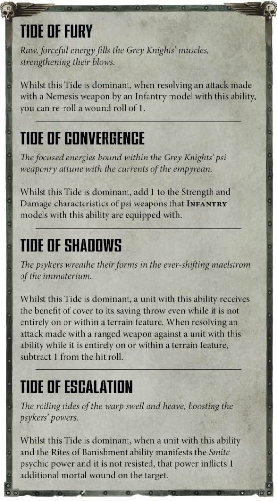 A new (WC5) psychic power from the Dominus Discipline (which we’ll be looking at shortly) lets you change the active Tide. While a cast and a power slot isn’t “free” by any means, being able to change these when needed is extremely good, and I can’t imagine a pure Grey Knight list that doesn’t bring at least one unit with this power.