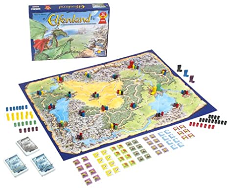 The game itself is played on a map of destinations, interconnected by paths over different terrain, with everyone starting in the main Elf City. The terrain limits which transport can be used - a magic cloud can take you over a mountain but an elfcycle would be useless on water. You and the other players will start each round by drawing out tiles representing the forms of transport, and then putting them on paths on the board. You only have a few tiles, so you will be relying on what others put down to travel far. You also have a hand of eight travel cards. You can travel on a type of transport only if you can discard matching transport cards to pay for it.