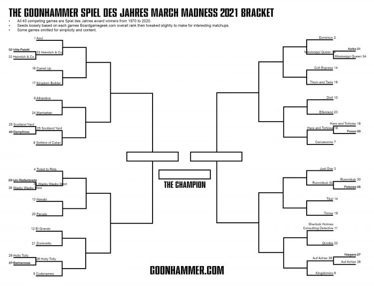 Wondering what this is all about? The Turn Order writing crew is talking about every game to ever win the Spiel de Jahres award—think of it as the Oscars of Board Gaming. We introduced the bracket and spent some time with the "Play-In" games in each bracket. You can catch up on all our coverage here.