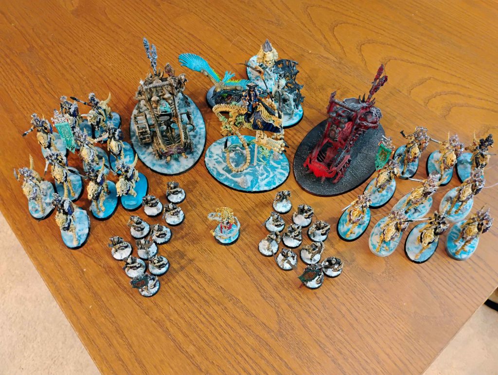 Arkhan is simply my favorite character in the game, even if he isn’t the best. I love him and want to put him on the board. The Mortek Crawlers do decent damage output from ranged and can hand out fights last. Deathriders are fast and have a lot of attacks to take out things that get too close to the castle. Mortek Guard protects the important bits as cheap screens.