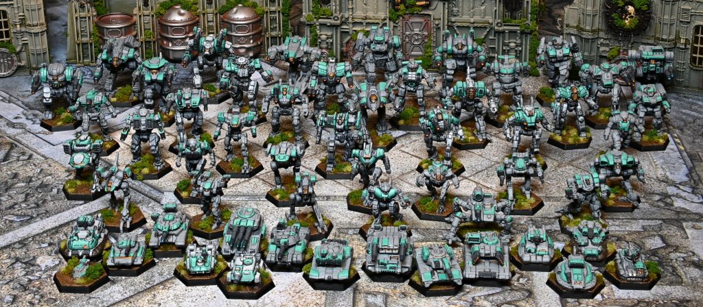 One of my more prolific painting exploits this year has been my new scheme for Battletech; about July my box for the latest KS turned up and that meant I once again had an absolute deluge of models that I was never going to get through with my previous schemes. To have a hope of eventually ending my backlog I decided to try out playing with a new scheme, and honestly, it's been a huge success. It's fast and pretty, which has meant I can get this many models done in the random gaps and breaks I take from working on other stuff! Turns out being able to do ~7 models in a night or two is a good way to stack them up.