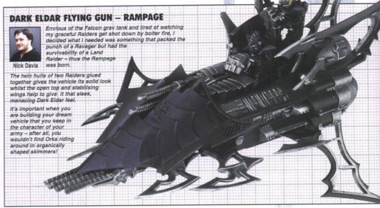 lowest result on the glancing/penetration tables, and that any crew stunned results were changed to crew shaken; they could also take vectored engines so that an immobilised skimmer (which meant a dead skimmer if moving fast) would just drift gently to the surface instead and suffer no other ill effects. This made actually killing one incredibly hateful - you could only glance them, and if you did you could only kill them on a 6, but you had to roll 2d6 pick lowest, and half the results barely mattered to them. Cue Eldar players skimming merrily around the board all game in invincible grav-tanks, merrily blowing away your army as you struggled to land a glove on them.