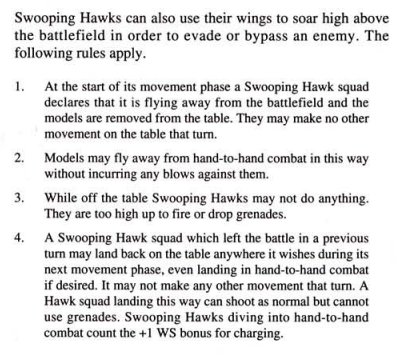 Ok though, it's just a grenade, right? Someone has to get close to lob that thing at you - just avoid them. "That's easy to do Rob, you big fuckin' idiot," you say, like some kind of ignorant rube. Well, lemme tell you about another 2nd edition piece of Wargear: Swooping Hawk Wings. Eldar Exarchs could take Swooping Hawk Wings as a piece of wargear. These tended to function just like jump packs, only better - a 20-point upgrade that let you jump over obstacles and move long distances, only you'd also get the -1 to hit them if they moved fast (which jump packs didn't give you). Oh and also, they could fly high, disappearing off the table and reappearing anywhere the following turn, as shown here: