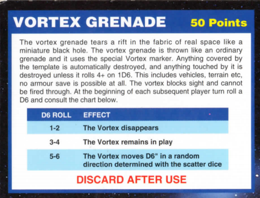 Greg: It’s pretty funny that for several editions there you literally could not kill someone with a grenade. They were wargear that just did stuff with initiative during charges, and weren’t actually weapons.