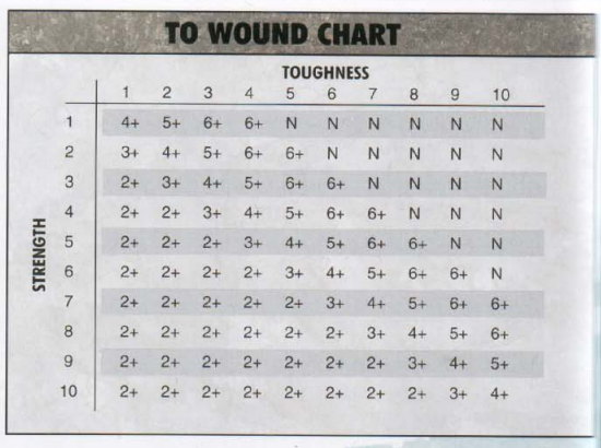 Rob: It was real bad. One of the best things they did with 8th edition was streamline the WS/BS and S/T charts to remove all of the nonsense and make it very easy to understand what your models hit on, and what you needed to roll to wound. Look at this nonsense:
