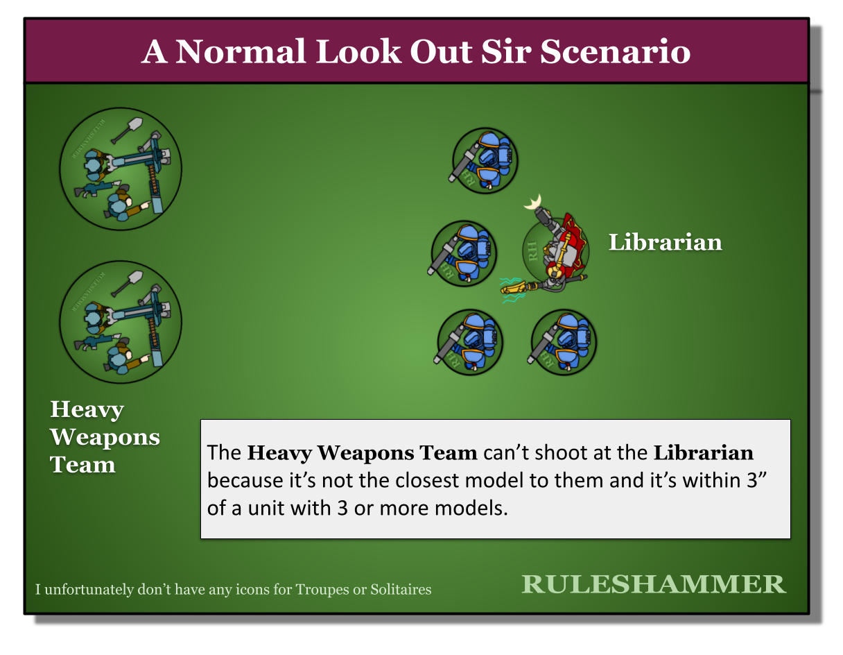 So in a normal Look Out, Sir scenario, a unit of Troupes would be able to protect a character. Like the Marines in this Diagram below are protecting a Librarian.