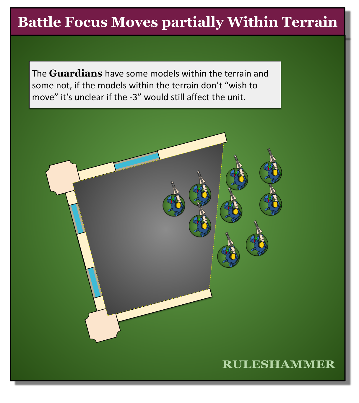So really what the heck does "wish to move" mean. Like if you're using Battle Focus then don't all the models wish they could move and some of them can't because they're on a terrain feature? I'm not being serious with that suggestion but it's pretty odd phrasing. Especially as if any of them wish to move, the 3" subtraction is for the every model in the unit. So what if you're in the situation below?