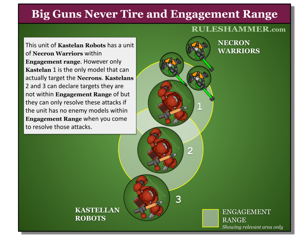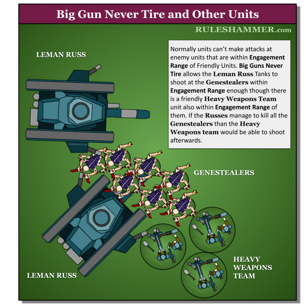 Welcome to Ruleshammer! This article should help explain the ins and outs of Big Guns Never Tire, the Tau Battlesuit rule (which is very similar), and Pistols which are surprisingly different.