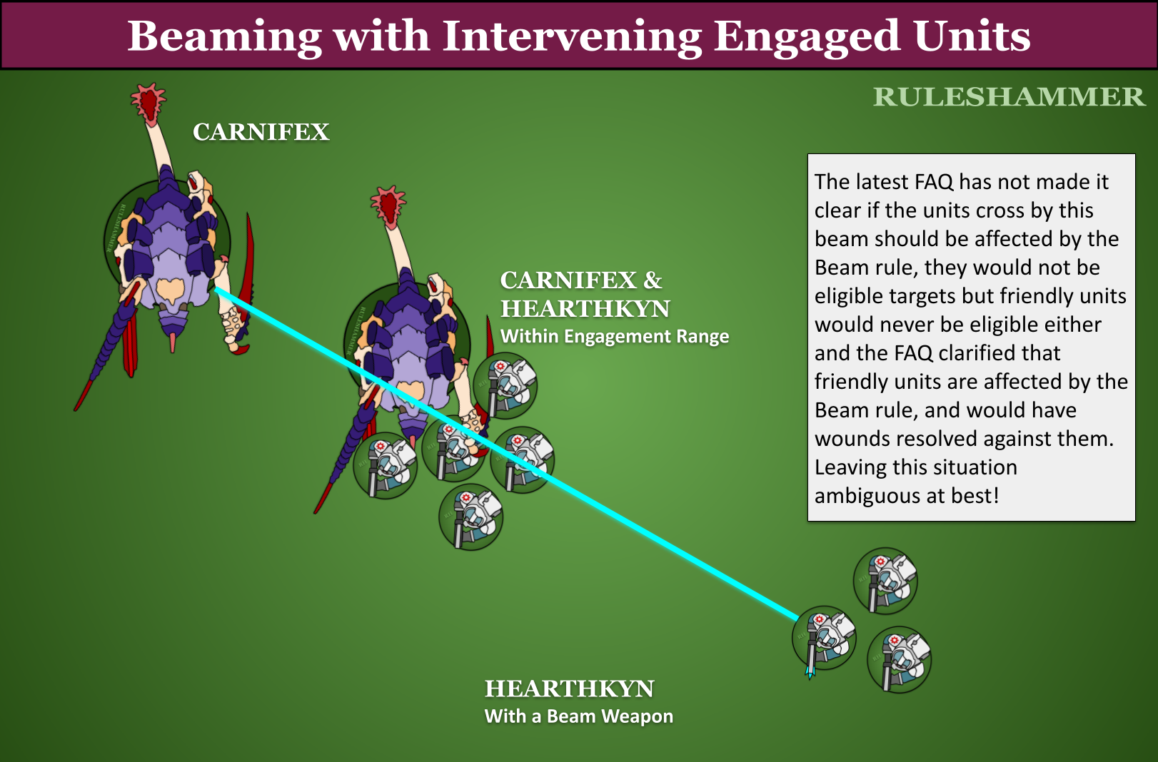 So while this weapon could beam through to hit out of sight things or intervening characters that weren't targetable it was ONE weapon in an army and only has 12" of range. So actually getting into a position to do those things had several layers of difficulty to it. Where as Votann could do it far more easily and more often, hence the restriction. Using this interpretation, both the friend and enemy units locked in combat would have beam wounds resolved against them if visible and not character units.Q: If an attack with a beam weapon scores one or more additional hits on the target, do those additional hits also trigger wound rolls against any intervening units? A: Yes. Each time an additional hit is scored against the target, that hit counts as its own attack, and so will cause a wound roll to be made against any intervening units.