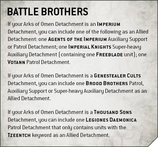 You can only include an Allied Detachment if its Faction is a permitted Allied Detachment for your Arks of Omen Detachment, as described in the Battle Brothers section on page 8.