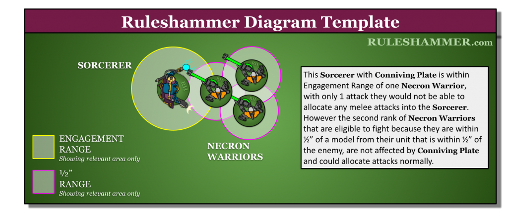 First of all I've seen some players already try to claim there's no issue here because the units are within Engagement Range of each other, if any two models from each unit are within Engagement Range of each other. That has no bearing on this interaction at all, that's just there for other rules such when shooting to establish what a "unit within Engagement range" is for which units are allowed to shoot. Conniving plate specifically affects models within Engagement range, which means it doesn't affect models that are able to fight for being within 1/2" of a friendly model within 1/2".