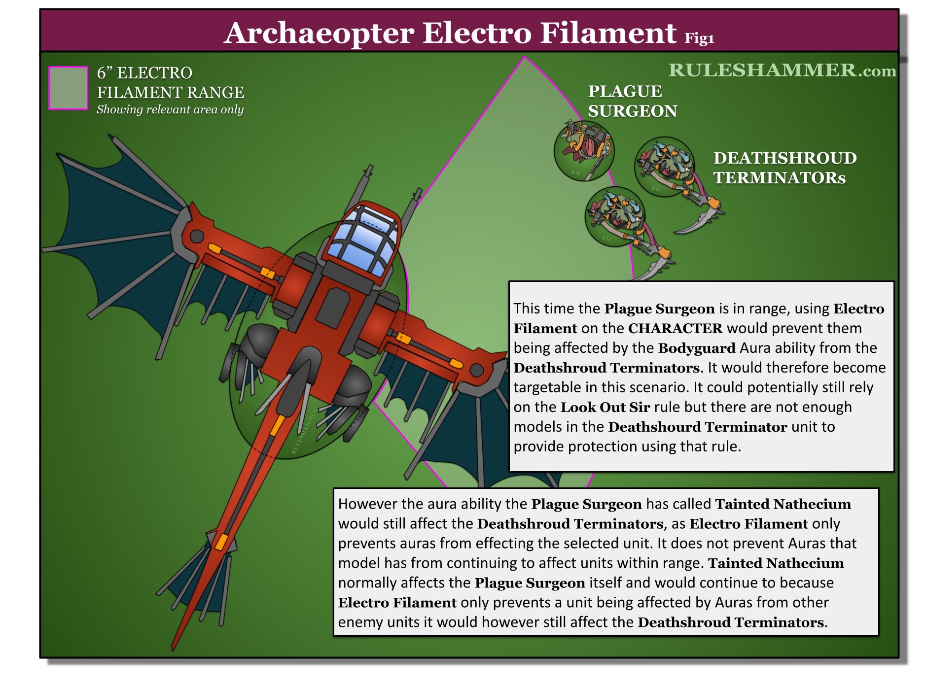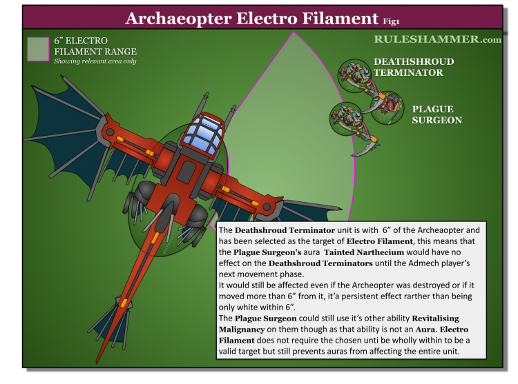 Aura around the ARCHAEOPTER like the old one, It continues to affect the chosen unit until the Admech player's next movement phase and it now only affects a single unit rather than all units within 6”. The second big change is that instead of causing the aura abilities models have from having no effect, it now prevents the chosen unit from benefiting from aura abilities. Lets see how this looks on the battlefield.