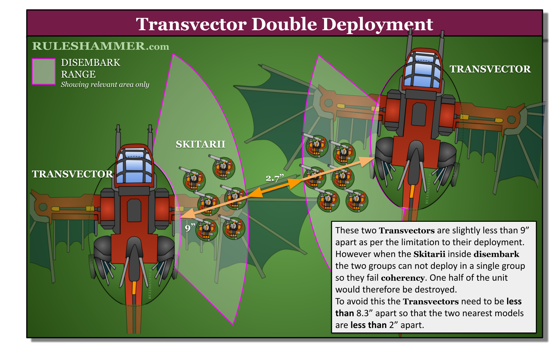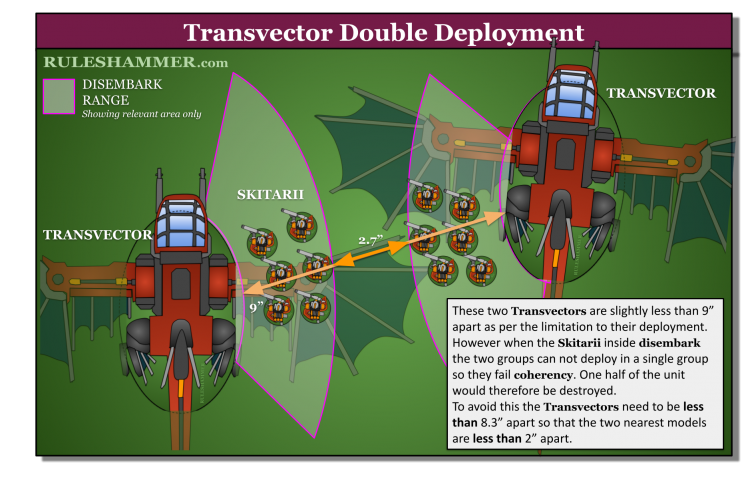 When those two TRANSPORT models are setup, they must be set up within 9” of one another, and any disembarking units must follow the normal rules for disembarking transports and coherency.