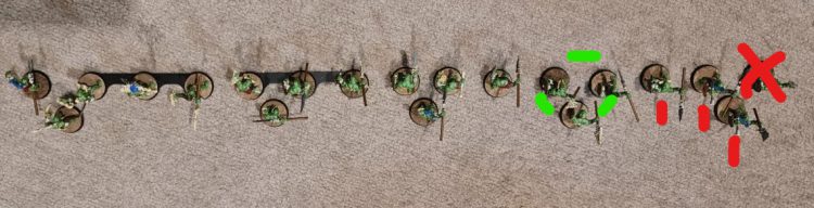 Secondly, this formation is a house of cards: as soon as you remove one single model, your edge rushers are isolated and the entire line collapses right back down to 5 models.
