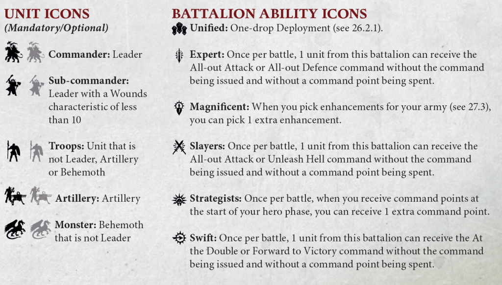 Each Battalion has units filled in for unit roles that are required and faded for optional additions. These are not like Warhammer 40,000s force organisation charts, you are not required to use them to complete your list. It's not clear the benefit of including optional units in Warlord or Command entourage. Battle Regiment allows you a single drop like Battalions