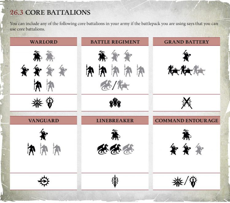 Core Battalions. Core Battalions are a new mechanic for the game: Much broader requirements, requiring certain types of units instead of specific ones and grant a small bonus when taken. Whether these cost points or not isn't clear, we need to wait for the General's Handbook but for now they appear to be free. The Core Rules state that you're allowed to use them as long as the battlepack you're using allows them – in turn this allows events to pick and choose what they want to be included, or allows Games Workshop to add new Core Battalions in each years