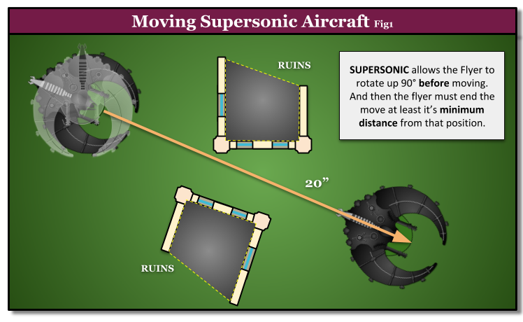 Supersonic: Each time this model moves, first pivot it on the spot up to 90° (this does not contribute to how far the model moves), and then move the model straight forwards. Note that it cannot pivot again after the initial pivot. When this model Advances, increase its Move characteristic by 20″ until the end of the phase – do not roll a dice.